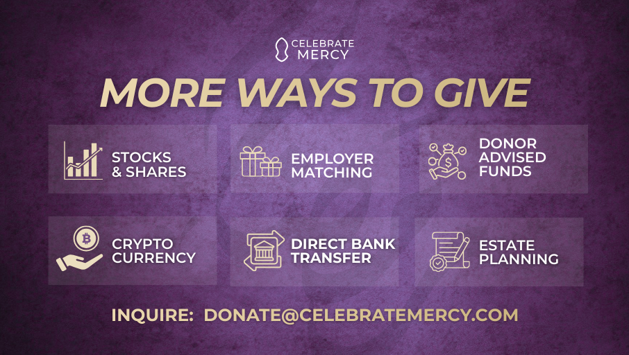 There are many ways to support CelebrateMercy in addition to making a one-time or monthly donation. If you’d like to contribute with cryptocurrency, estate planning, stocks/shares, or gold/jewelry, please fill out the form below or email us at donate@celebratemercy.com, and we will gladly discuss these options with you.